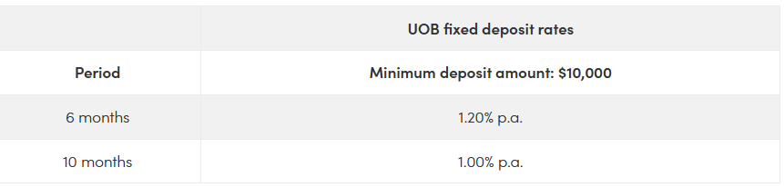 UOB's fixed deposit rate is currently 2-tiered-1.20 per cent p.a. for a deposit period of six months and 1.00 per cent p.a. for a deposit period of 10 months. This rate applies as long as you deposit a minimum of $10,000.