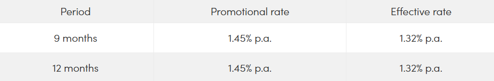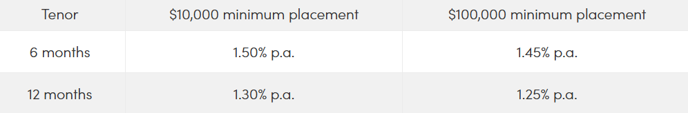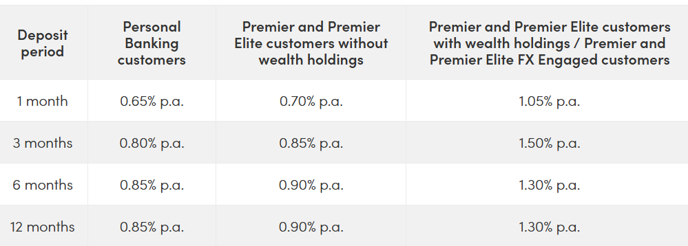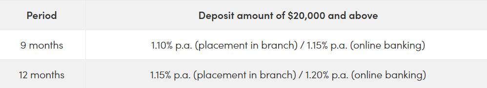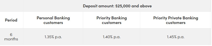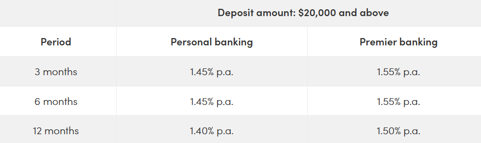 The highest rate personal banking customers can get is 1.45 per cent p.a. with a minimum deposit requirement of $20,000-pretty average right now. Currently, this rate applies to two of the three available tenors: three and six months. If you are a Premier Banking customer, you can get a rate of 1.55 per cent p.a. for a 3- or 6-month period.