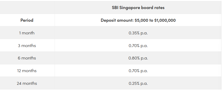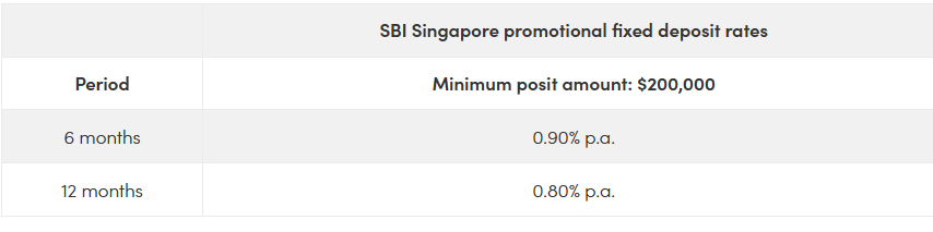 The State Bank of India is currently offering two promotional fixed deposit rates for a minimum deposit of $200,000: 0.90 per cent p.a. for a tenor of six months and 0.80 per cent p.a. for a tenor of 12 months. Whew, that is no small sum of money — and sadly, not very high interest rates.