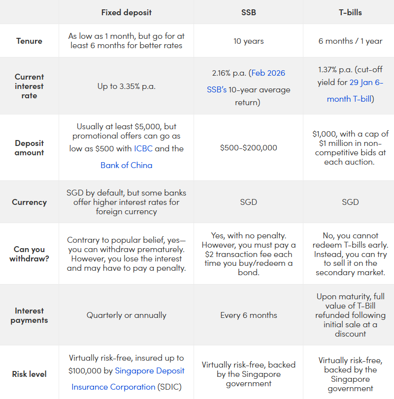 If you're looking for a virtually risk-free investment vehicle, you're bound to have come across fixed deposits, Singapore Savings Bonds (SSB) and Treasury bills (T-bills). Which is the right one for you? Here are some key differences you should consider.