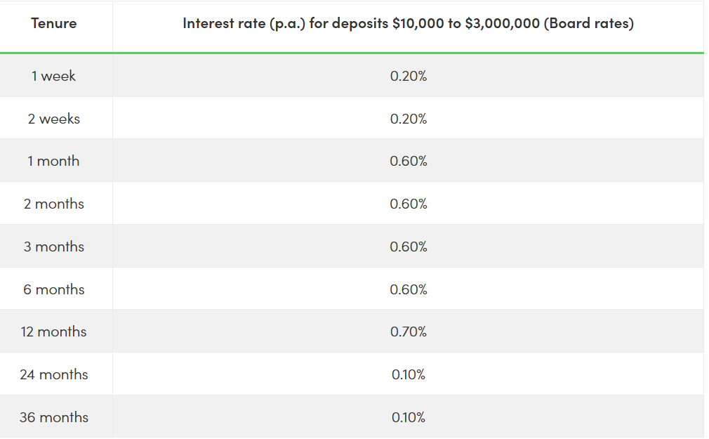 The highest board rate you'll get to enjoy is 0.80 per cent p.a., which is not worth your time. For example, with $500, you can get 1.35 per cent p.a. (three months) with ICBC or 1.35 per cent p.a. (three or six months) with the Bank of China.