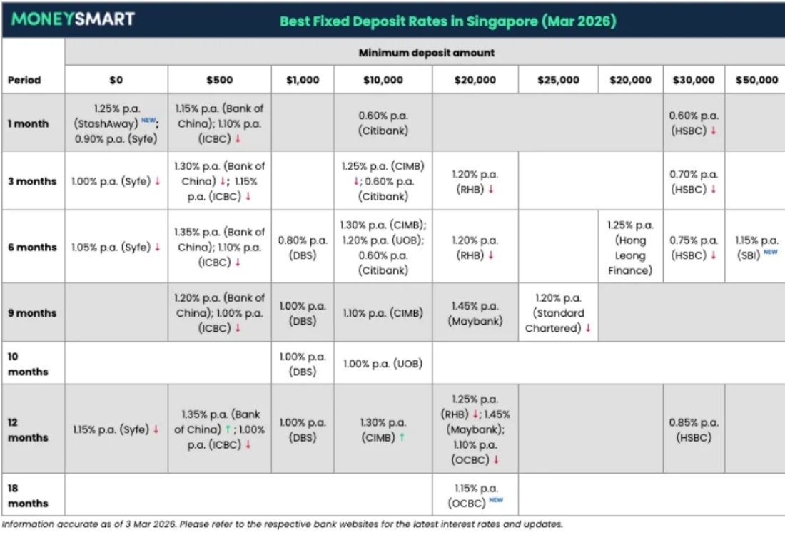 Best fixed deposit rates in Singapore (March 2026): Minimum deposits from $500, rates up to 1.5%