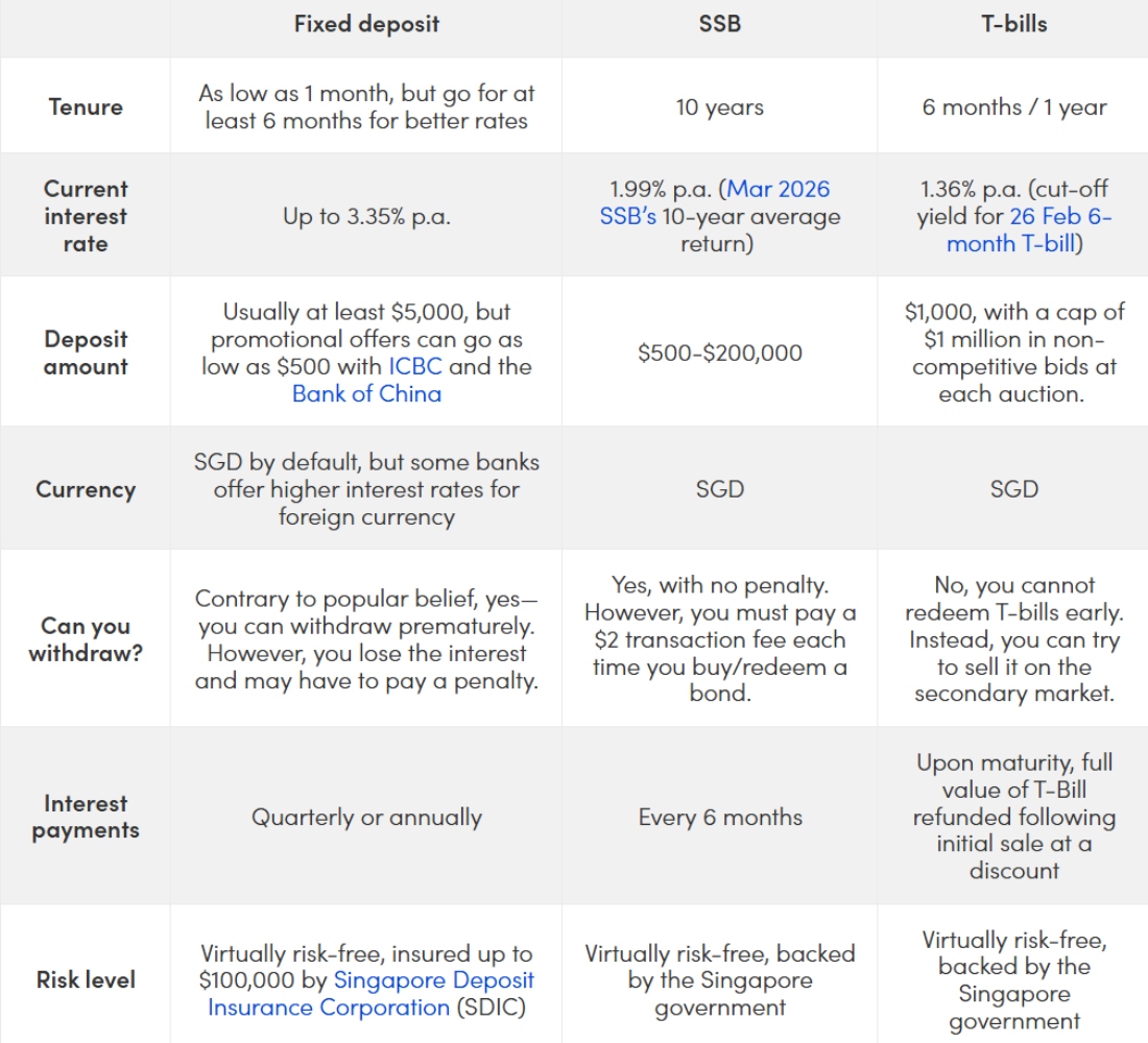 If you're looking for a virtually risk-free investment vehicle, you're bound to have come across fixed deposits, Singapore Savings Bonds (SSB) and Treasury bills (T-bills). Which is the right one for you? Here are some key differences you should consider.