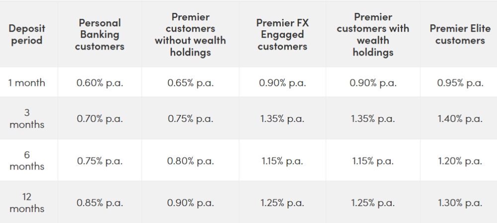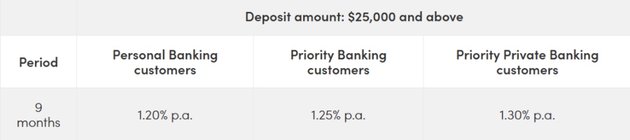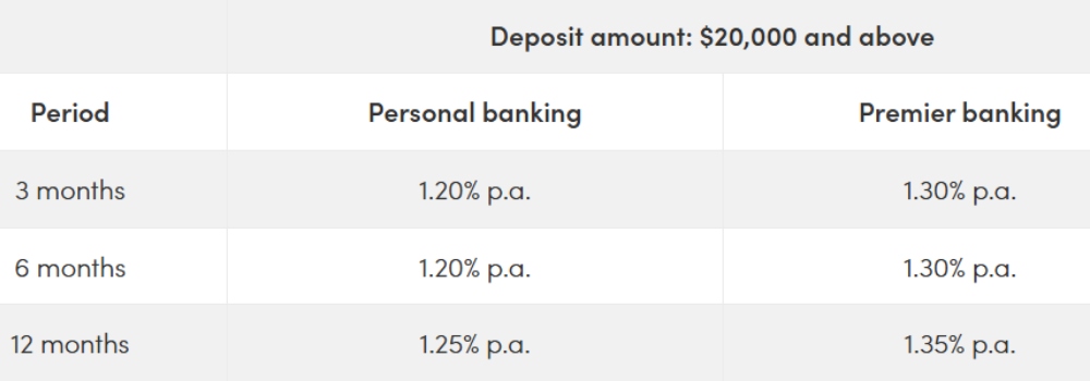 The highest rate personal banking customers can get is 1.25 per cent p.a. with a minimum deposit requirement of $20,000 — pretty average right now. Currently, this rate applies to one of the three available tenors: 12 months. If you are a Premier Banking customer, you can get a rate of 1.35 per cent p.a. for the same 12-month period.