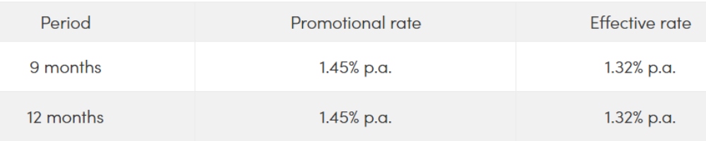 However, since the money in the savings account will only earn 0.05 per cent p.a., the effective interest rate you earn is actually 1.32 per cent p.a. That's still a good rate compared to other banks this month.