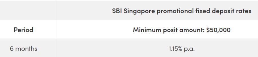The State Bank of India is currently offering one promotional fixed deposit rate for a minimum deposit of $50,000: 1.15 per cent p.a. for a tenor of six months. While $50,000 isn't exactly a small sum of money, at least the interest rate is comparable relative to other banks this month.