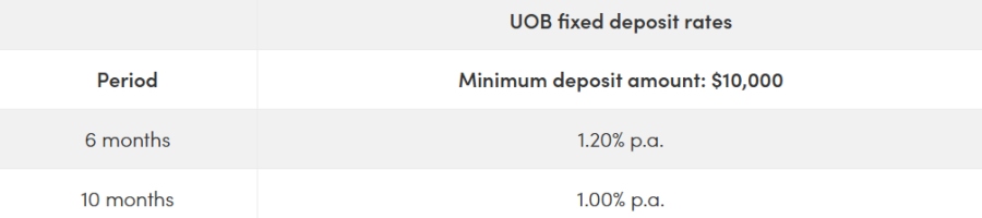 UOB's fixed deposit rate is currently two-tiered — 1.20 per cent p.a. for a deposit period of six months and 1.00 per cent p.a. for a deposit period of 10 months. This rate applies as long as you deposit a minimum of $10,000.