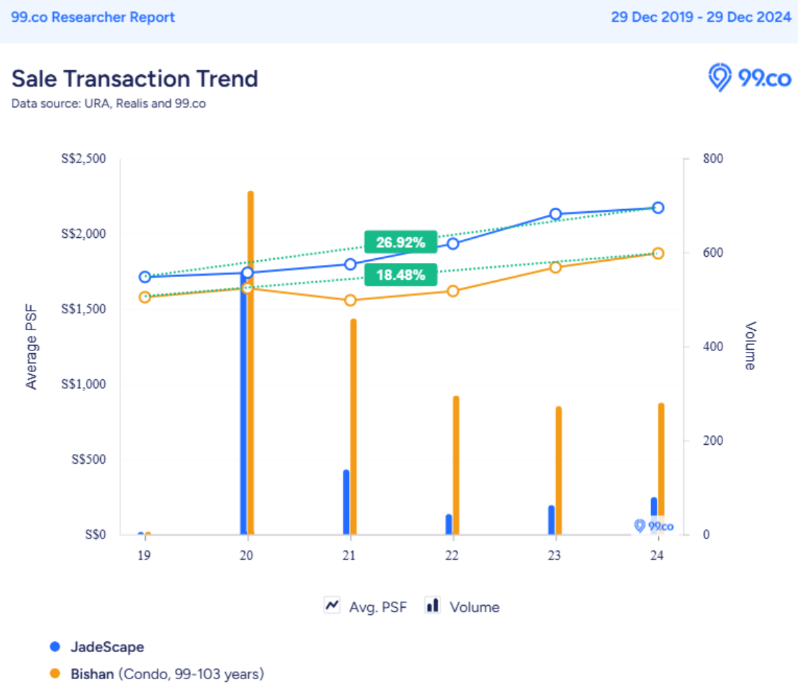 To gain deeper insights into JadeScape's market performance, we used 99.co Researcher to analyse its price trends over the past five years. This analysis offers a clearer picture of how JadeScape stacks up against the broader price trend for leasehold condominiums in Bishan.