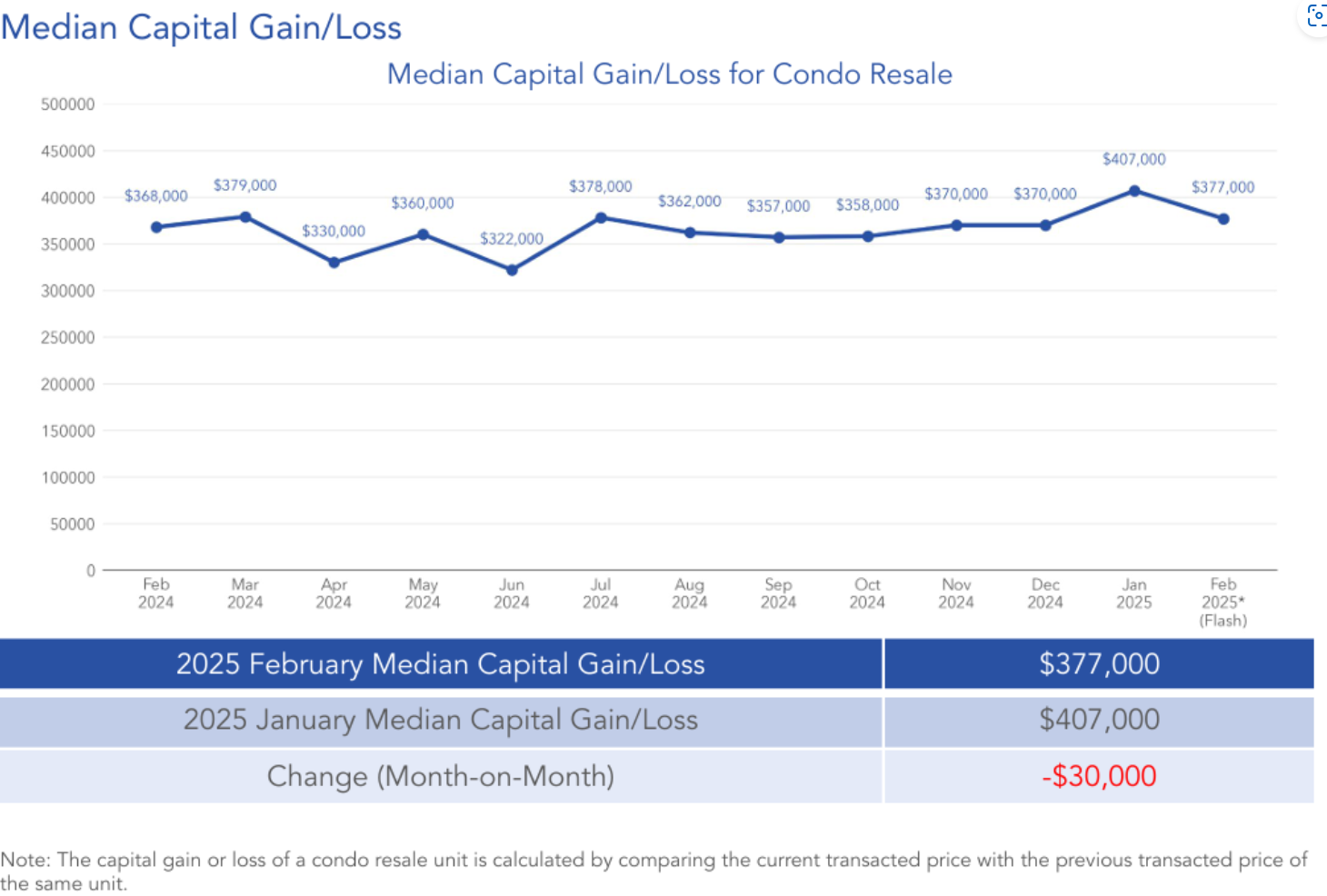 The median capital gain for resale condos in February 2025 was S$377,000, a decrease of S$30,000 from January.