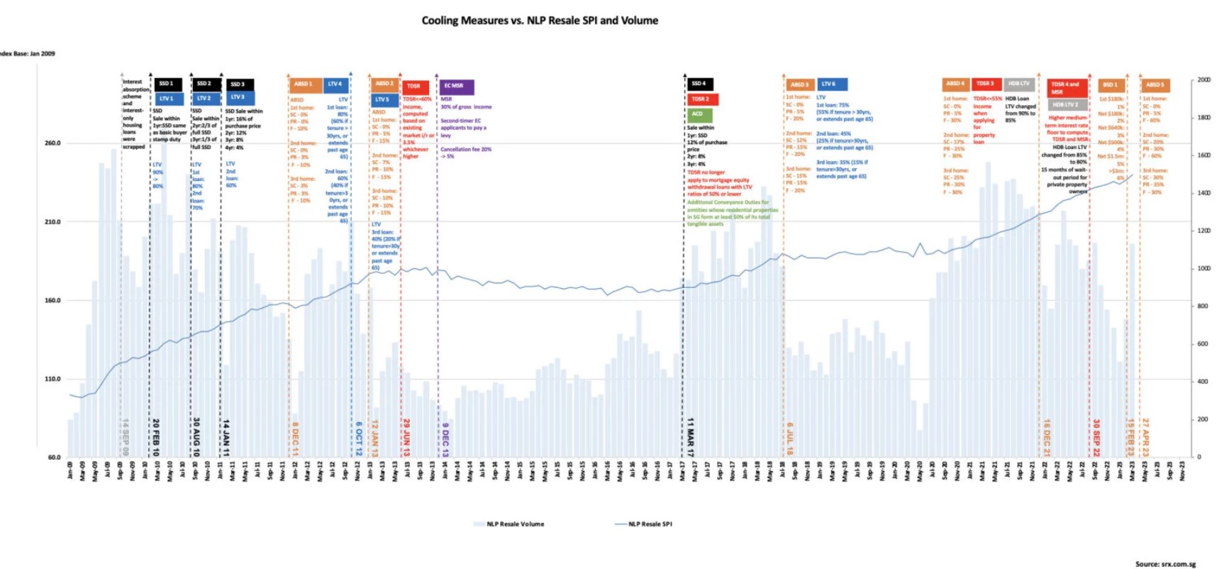 The SRX chart above shows the different cooling measures (marked by each vertical line and the corresponding policies) introduced in Singapore.