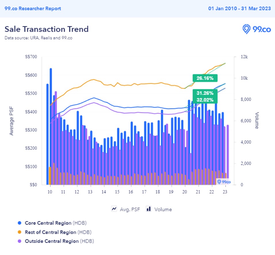 An overview of quarter-to-quarter average psf price and volume increases in the HDB market according to region. Quarterly average psf prices of HDB resale flats in the OCR have surged by 32.02% since Q1 2020, due mainly from COVID, WFH and families looking for larger spaces.