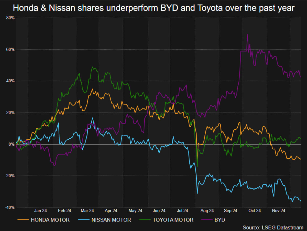 The two had combined global sales of 7.4 million vehicles in 2023, but are grappling with challenges from EV makers, particularly in China, where BYD and others have surged ahead.