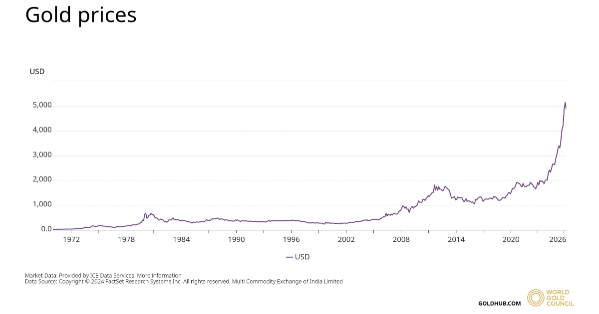 As you can see from the 20-year chart, gold prices have been rising since the late 2010s and reached new highs in 2025 and 2026. What's even more interesting is if we look at the movement of gold prices from 1970 to now: