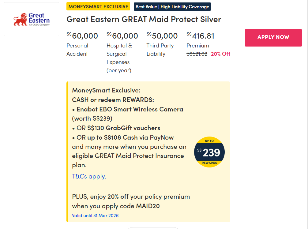 For example, Great Eastern GREAT Maid Protect premiums are on a 20 per cent discount with the code MAID20.