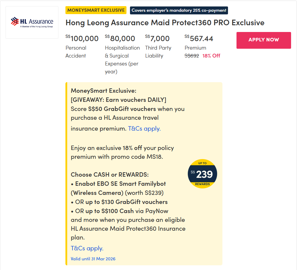 | Hong Leong Assurance Maid Protect360 PRO Enhanced | $556.90 | $2,000 | $40/day (up to 30 days) |