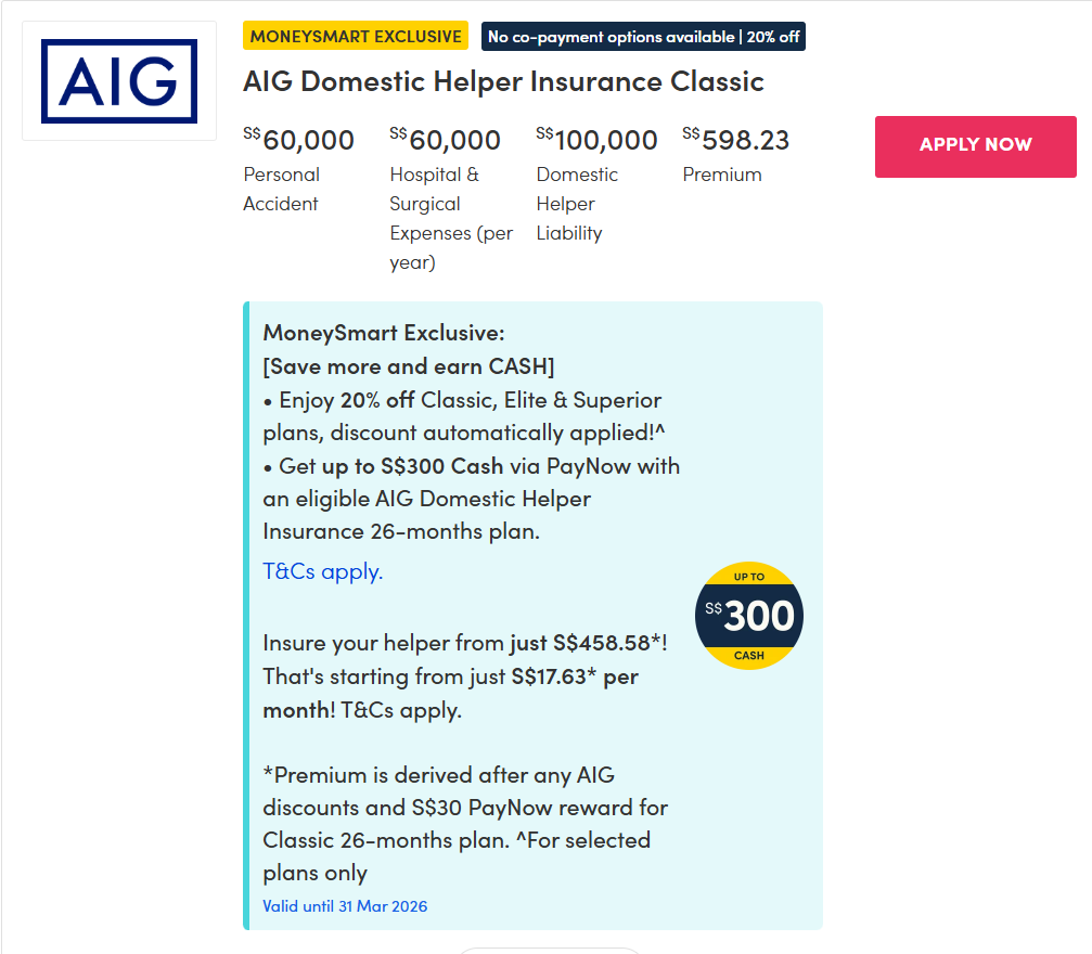 | AIG Domestic Helper Insurance Classic | $598.23 | $60,000 | $30/day |
