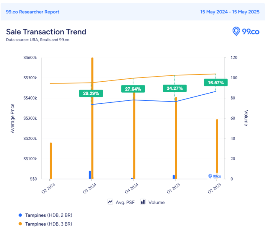 Clearly, the price gap is closing. In the last three quarters, the average price difference between the two flat types stood at 30 per cent. As of mid-Q2 2025, that margin has narrowed to just 16.57 per cent.