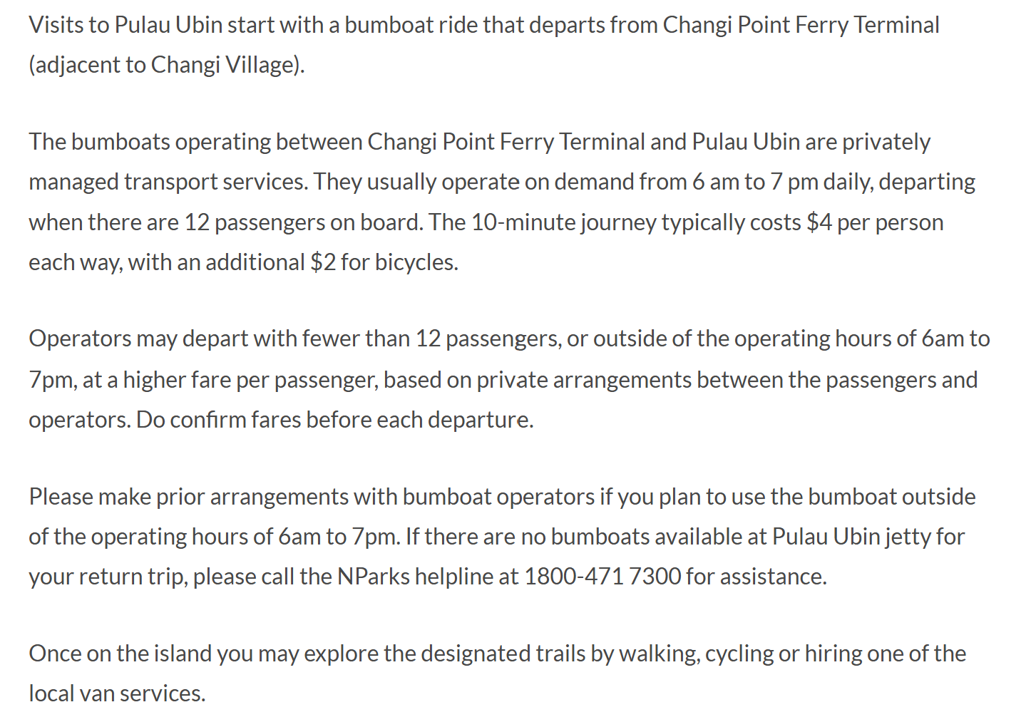 AsiaOne could not confirm what NParks' website said when Seah made his trip, but as of press time it read that the boats are "privately managed transport services" which "usually operate on demand from 6am to 7pm daily, departing when there are 12 passengers on board".