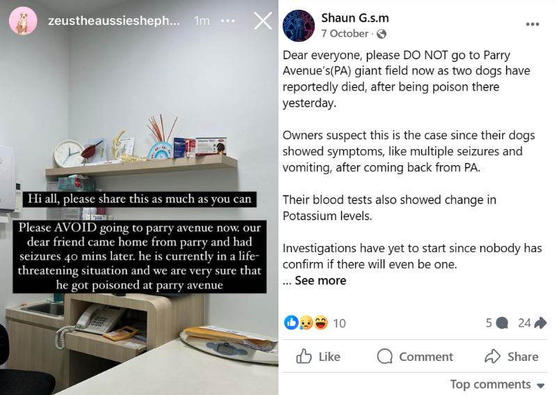 Across separate cases, the owners said on social media that their dogs experienced symptoms consistent with poisoning, such as multiple seizures and vomiting, after returning from the open field in Kovan.