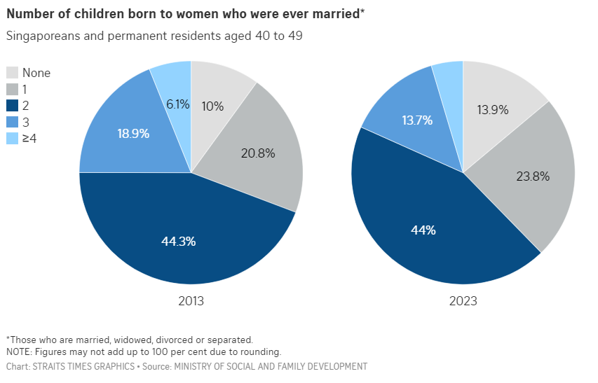 In 2013, 10 per cent of ever-married female residents aged between 40 and 49 did not have any children, and this rose to 13.9 per cent in 2023.