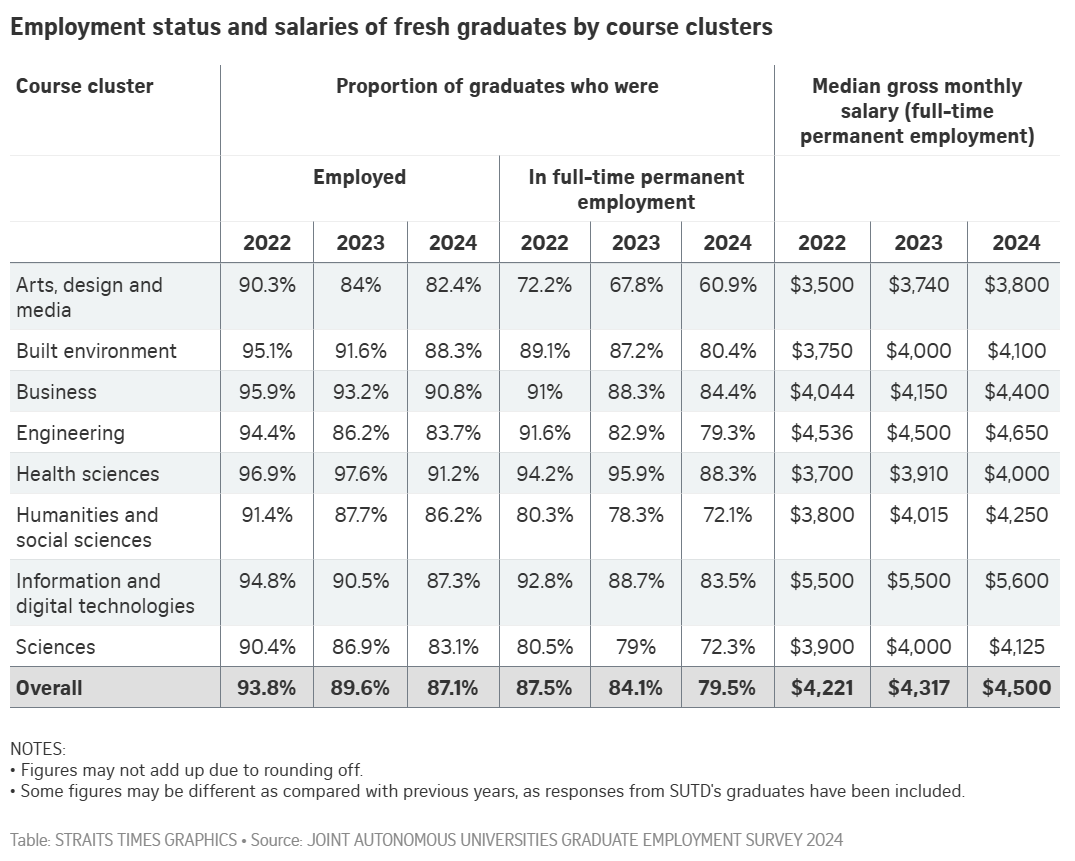 They were surveyed by the five universities on their employment status as at Nov 1, 2024, about six months after the completion of their final examinations.