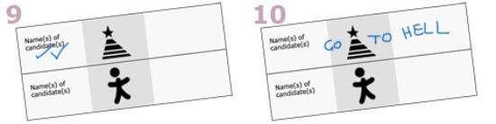 Ensure that your markings do not cross the boundary line as table chiefs routinely rejected ballots such as those as shown in examples three, 15 and 16. Also, do not make more than one marking, as seen in example four. Ballot papers where votes appear to be given for more than one candidate may be rejected.
