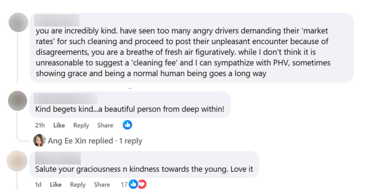 Netizens praised Ang, with some even sharing personal anecdotes of their children throwing up during car rides and being berated by PHV drivers.