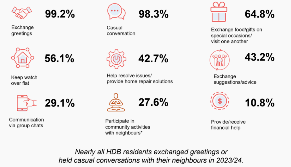 Almost all respondents said they interact with their neighbours, with 99.2 per cent having exchanged greetings and 98.3 per cent engaging in casual conversation.