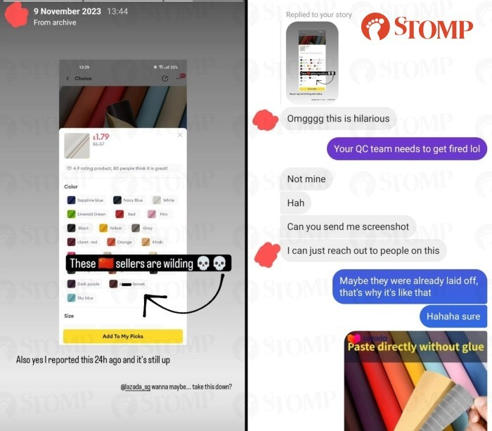 "I posted a screenshot on my Instagram story and tagged Lazada's Instagram account publicly. Lazada did not see the story, but my friend who works there saw it and offered to message someone internally to have the listing rectified.