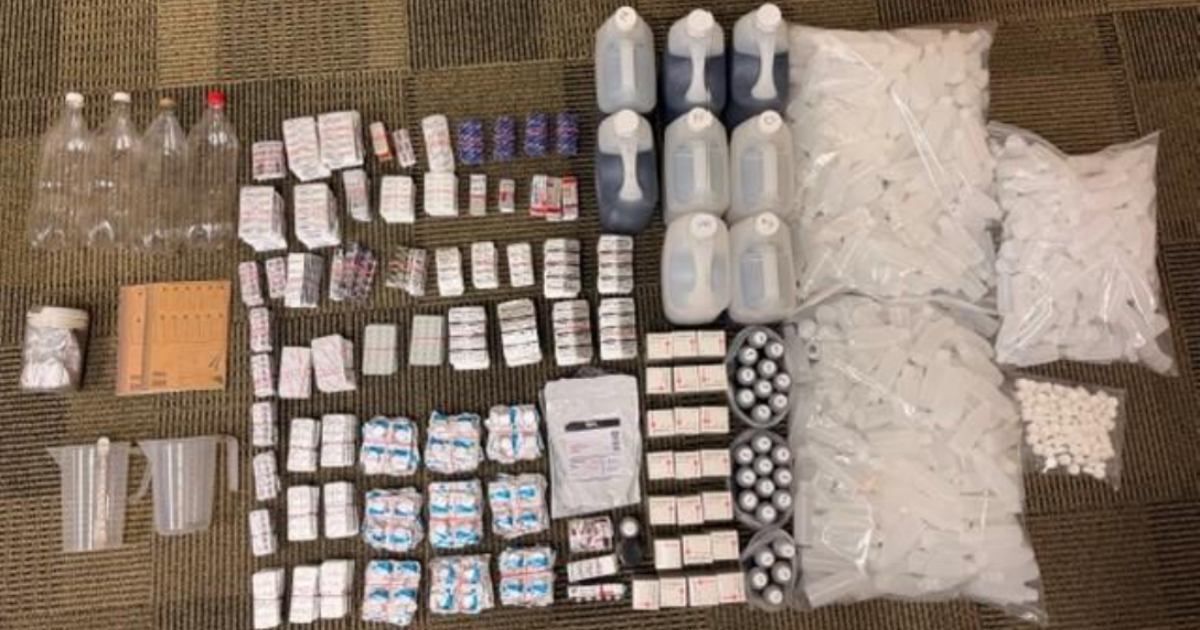 Officers found over 31 litres of illegal cough syrup and more than 5,200 units of addictive prescription medicines — with a total street value of around $21,500 — along with manufacturing equipment.