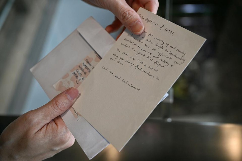 The in-flight customer service manager was so moved by this that he now keeps the notes with him at all times, tucked into his cabin bag.