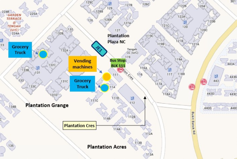 The grocery truck will be stationed at Plantation Acres (loading bay near Block 111A) on Wednesdays and Fridays, and Plantation Grange (carpark near Block 133A) on Thursdays.