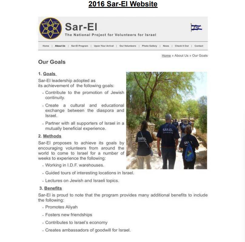 According to the statement, authorities found that Sar-El's website at the time stated that the organisation assists the IDF, and Sar-El's volunteers would work in IDF warehouses and be given guided tours of some locations in Israel, as well as lectures on Jewish and Israeli topics.