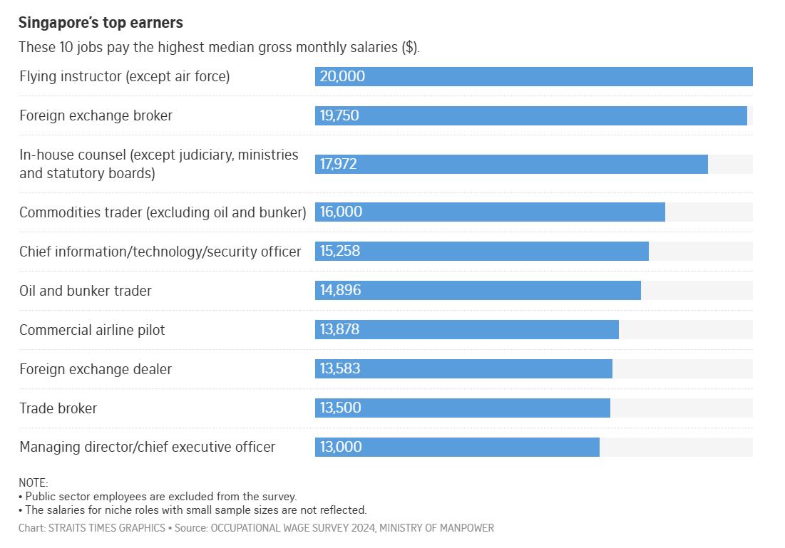 SINGAPORE — Flying instructors have emerged as Singapore's top earners — at least by median gross monthly salary, which stands at an impressive $20,000.