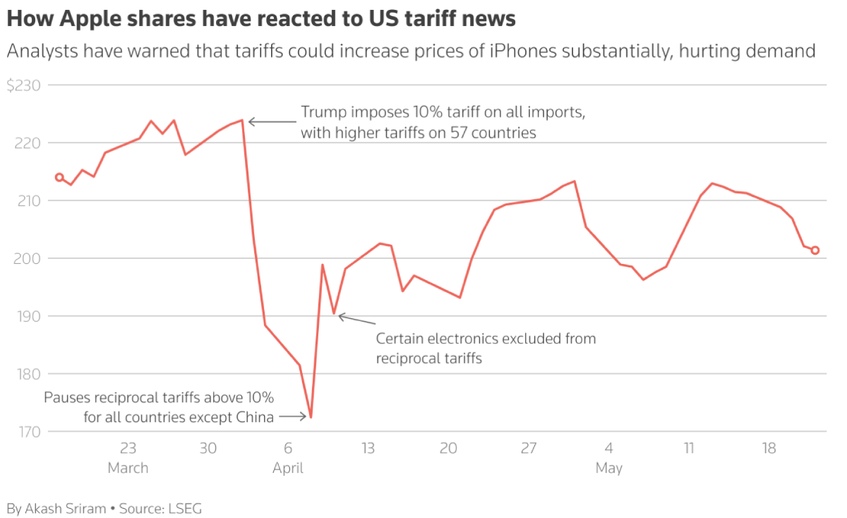Apple shares fell 3 per cent after Trump said in an early Truth Social post that he told company CEO Tim Cook "long ago" that "I expect their iPhones that will be sold in the United States of America will be manufactured and built in the United States, not India, or anyplace else."